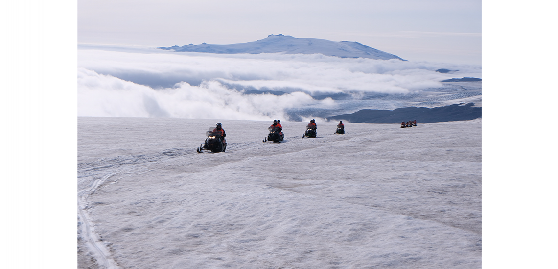 - เดินทางด้วยรถขนาดใหญ่เท่ารถสิบล้อขึ้นไปยังภูเขาไฟที่ปกคลุมด้วยหิมะและธารน้ำแข็ง เพื่อขึ้นไปขับขี่สโนว์โมลบิลเล่นกันอย่างเพลิดเพลิน